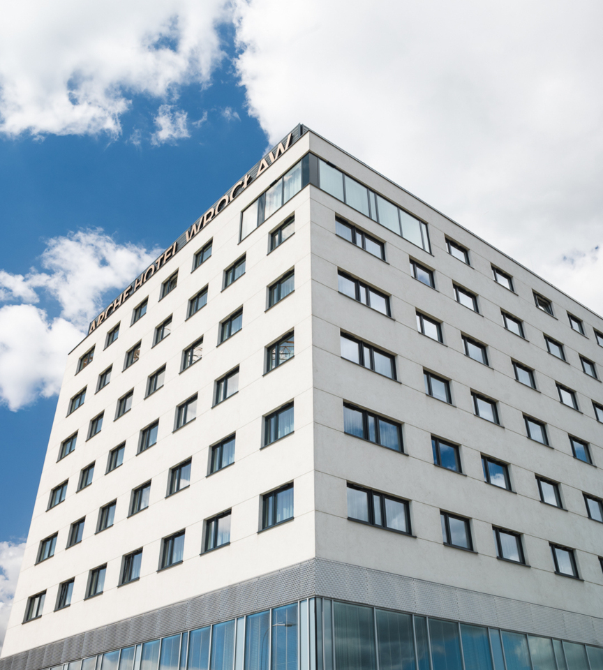 Modern Arche Hotel Wrocław with white facade, large windows, and greenery beside a busy street on a sunny day